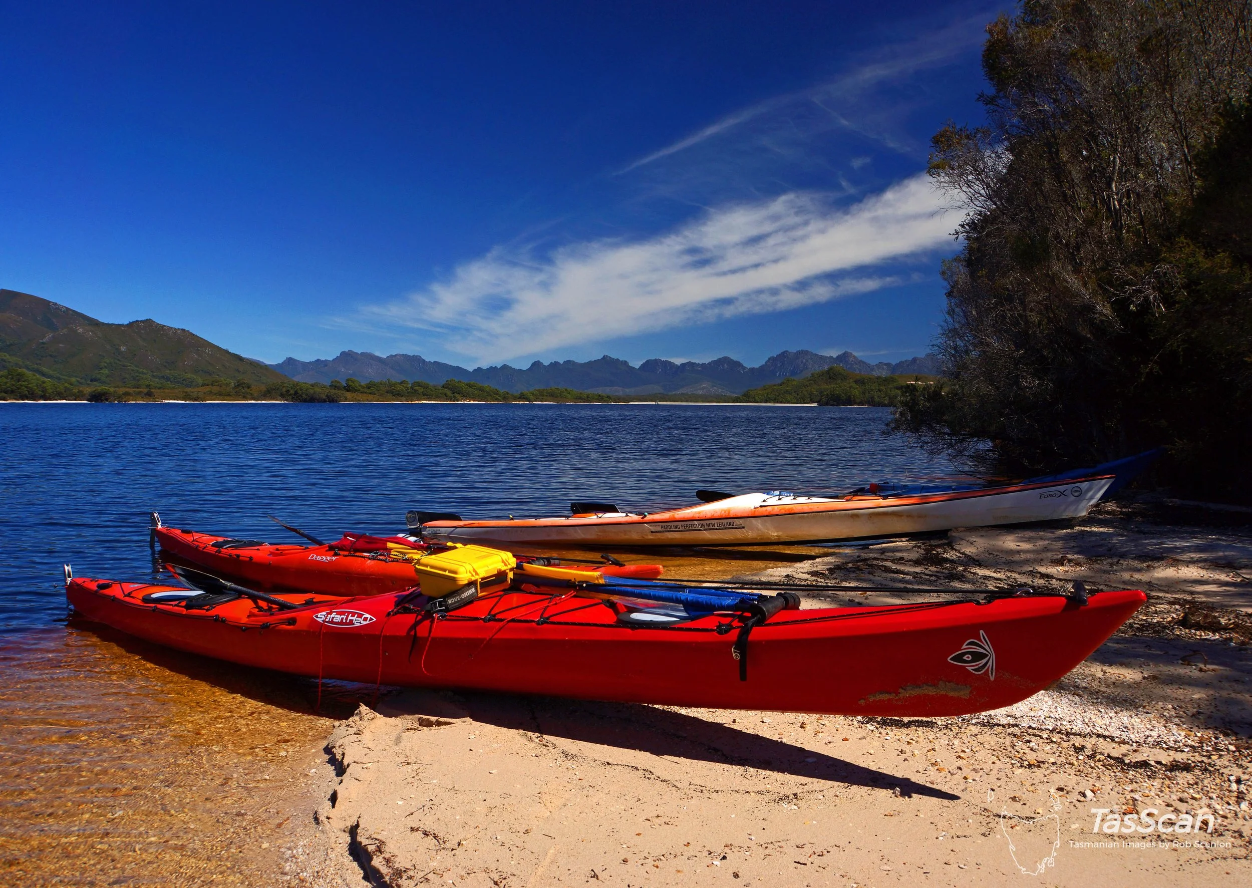 Beached kayaks on small island in Edgar Bay. Western Arthurs backdrop for view south