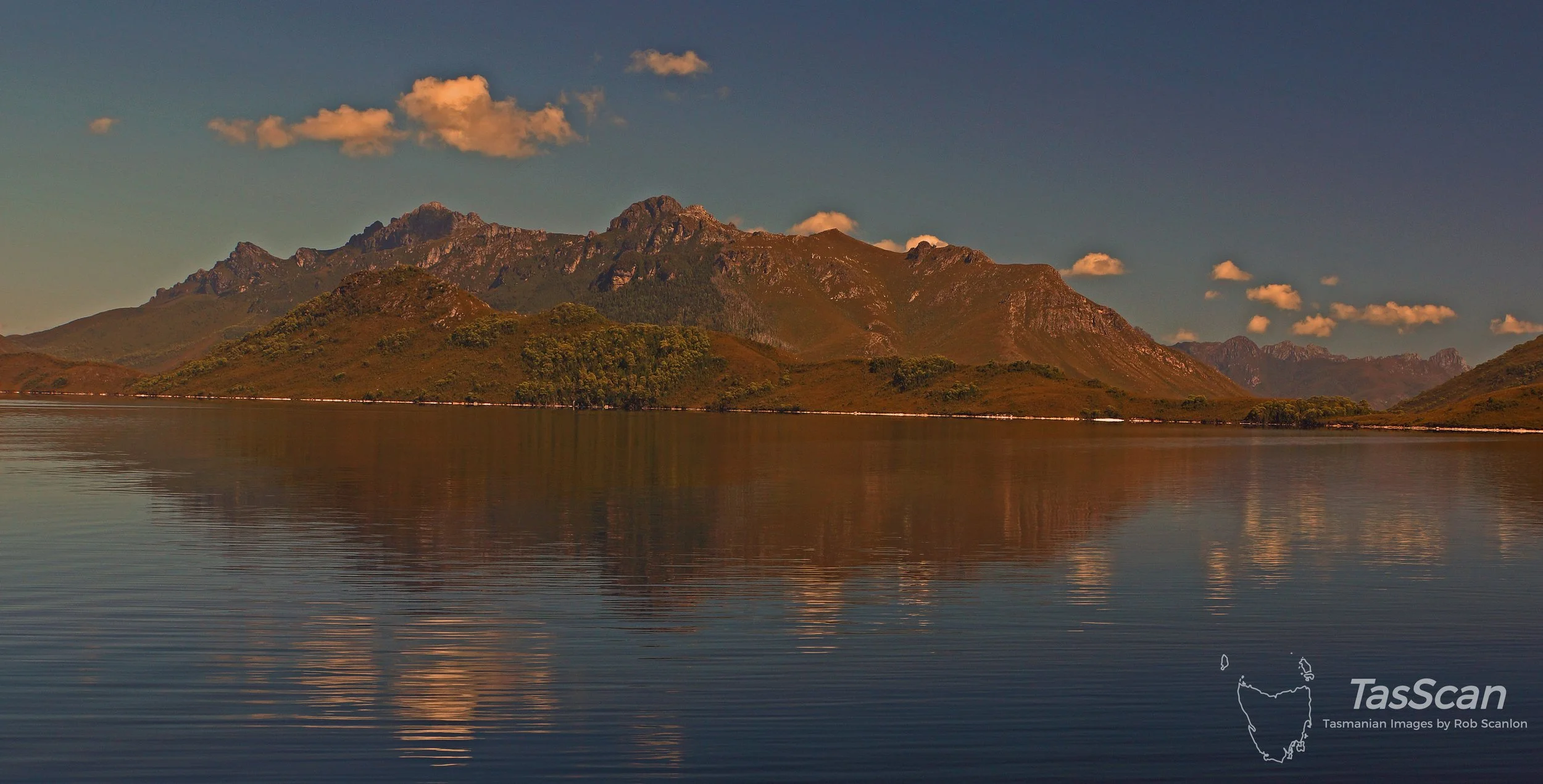 Barrier Island in foreground with Terminal Peak on eastern end of Frankland Range dominating image and Double Peak as the backdrop.