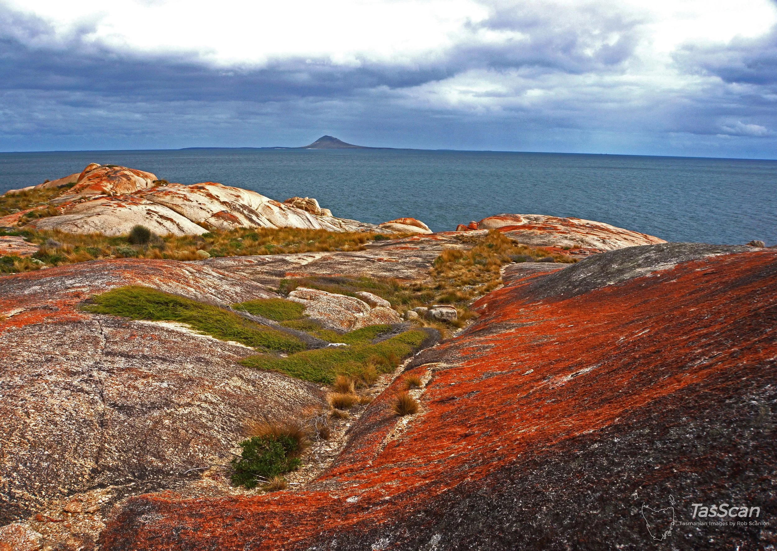 Mount Chappell Island west of Trousers Point in the distance. Orange lichen blended with hardy green mats.