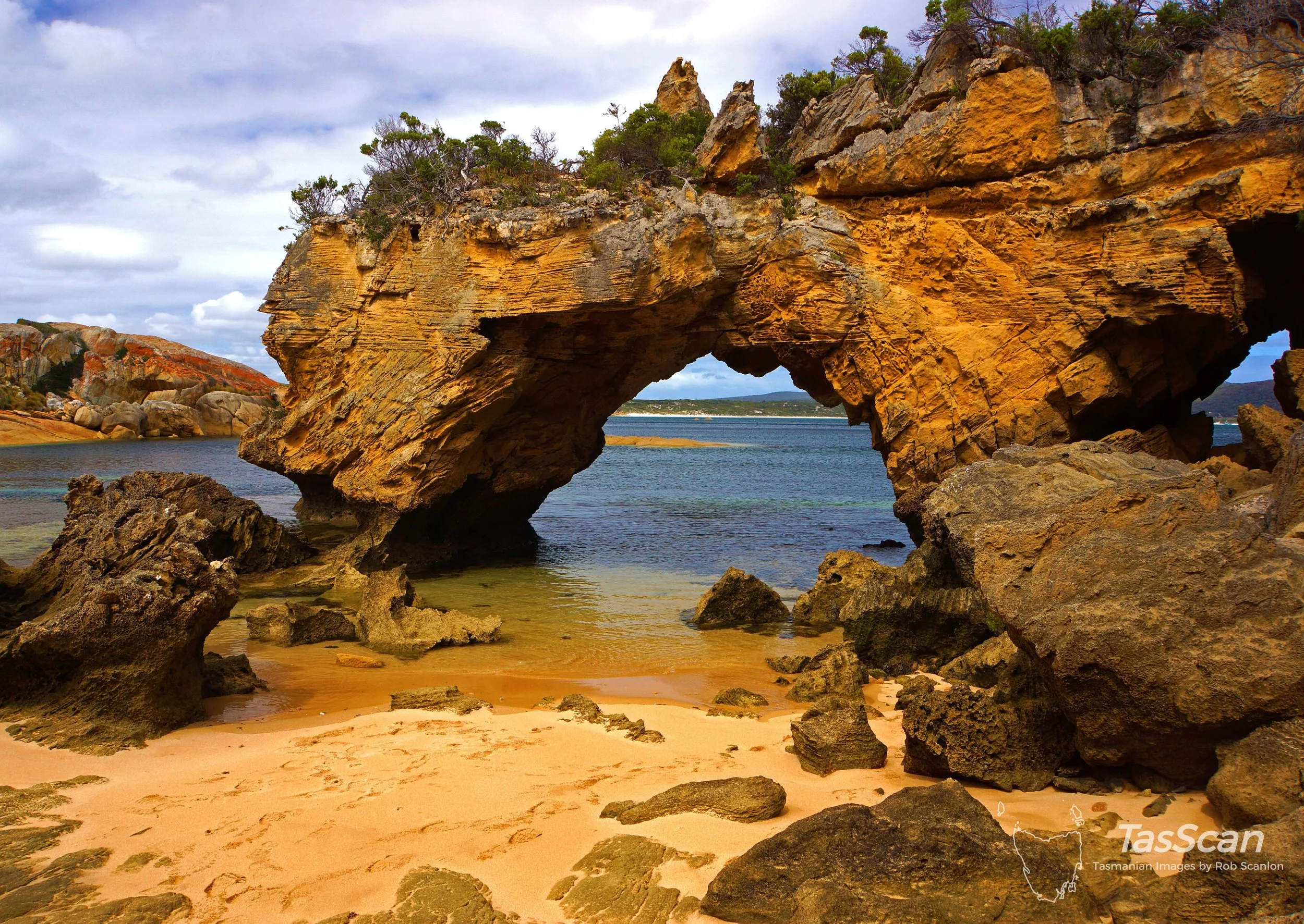 Northern Flinders Trail leads to impressive arch at Stacky's Bight that frames Killiecrankie Beach in the distance.