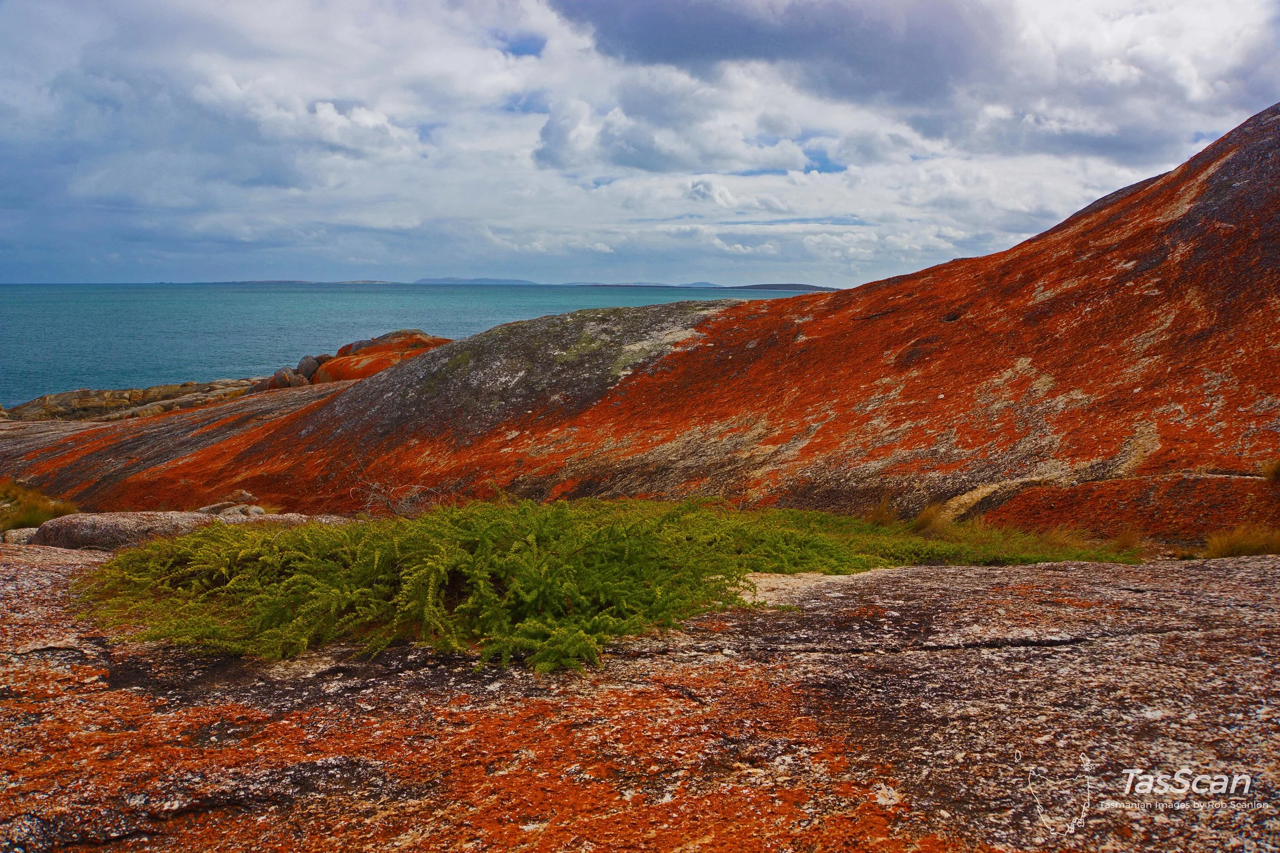 Stunning contrast of colours between ground cover and red lichen clinging to granite. Big Green and East Kangaroo islands with Prime Seal in the distance.