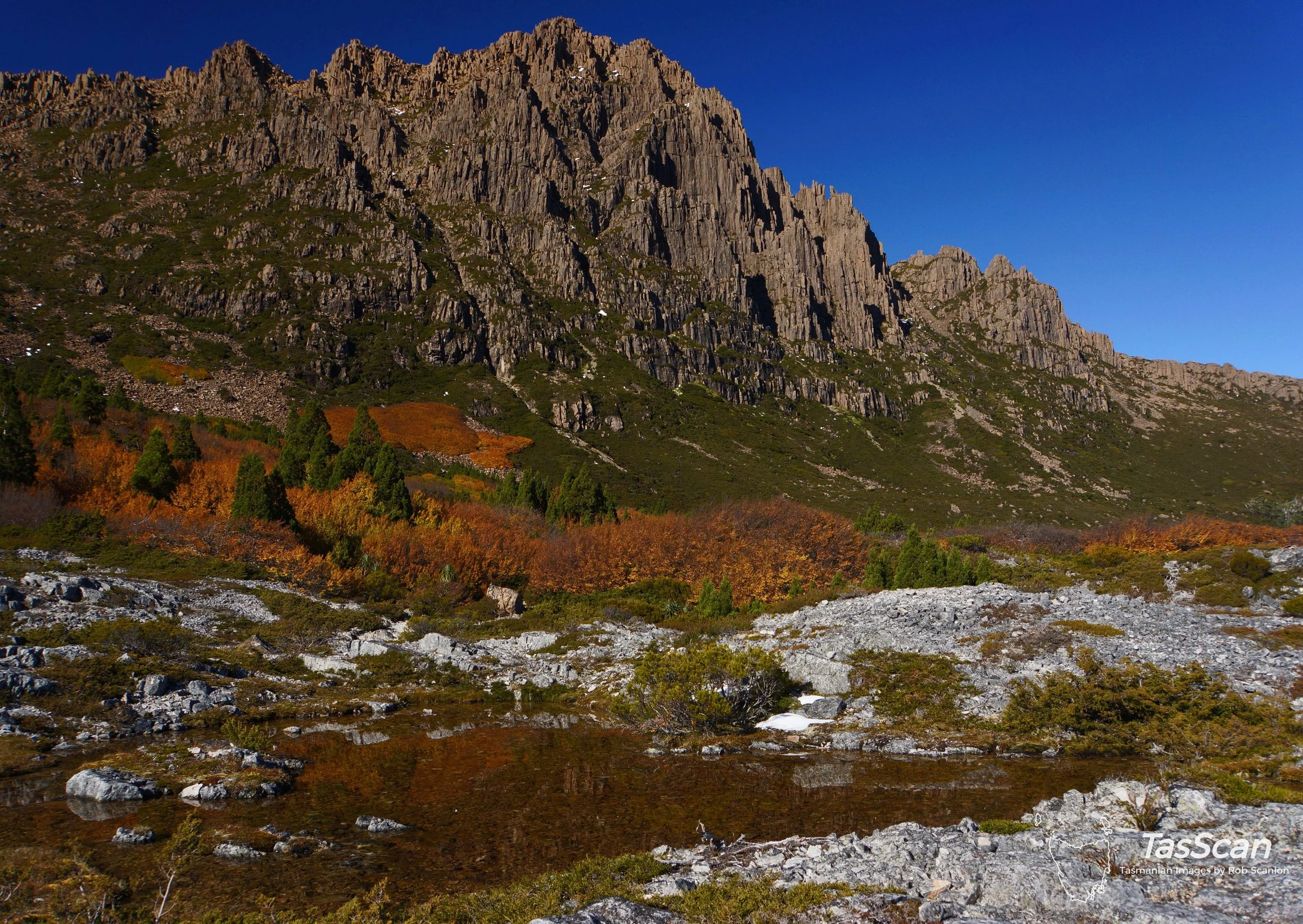 Western side of Cradle from Overland Track. Fagus colours most varied up the mountain scree.