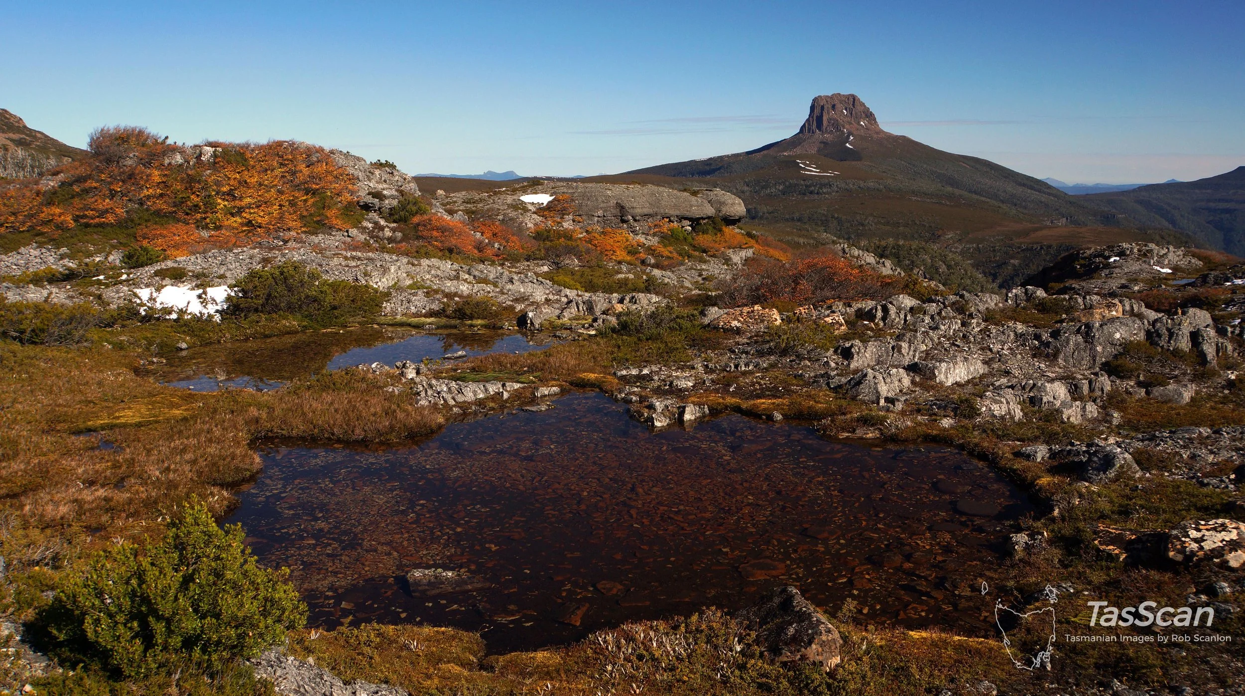 View south from Overland Track towards Barn Bluff. Small tarn in foreground with Fagus clinging to rocky outcrop.