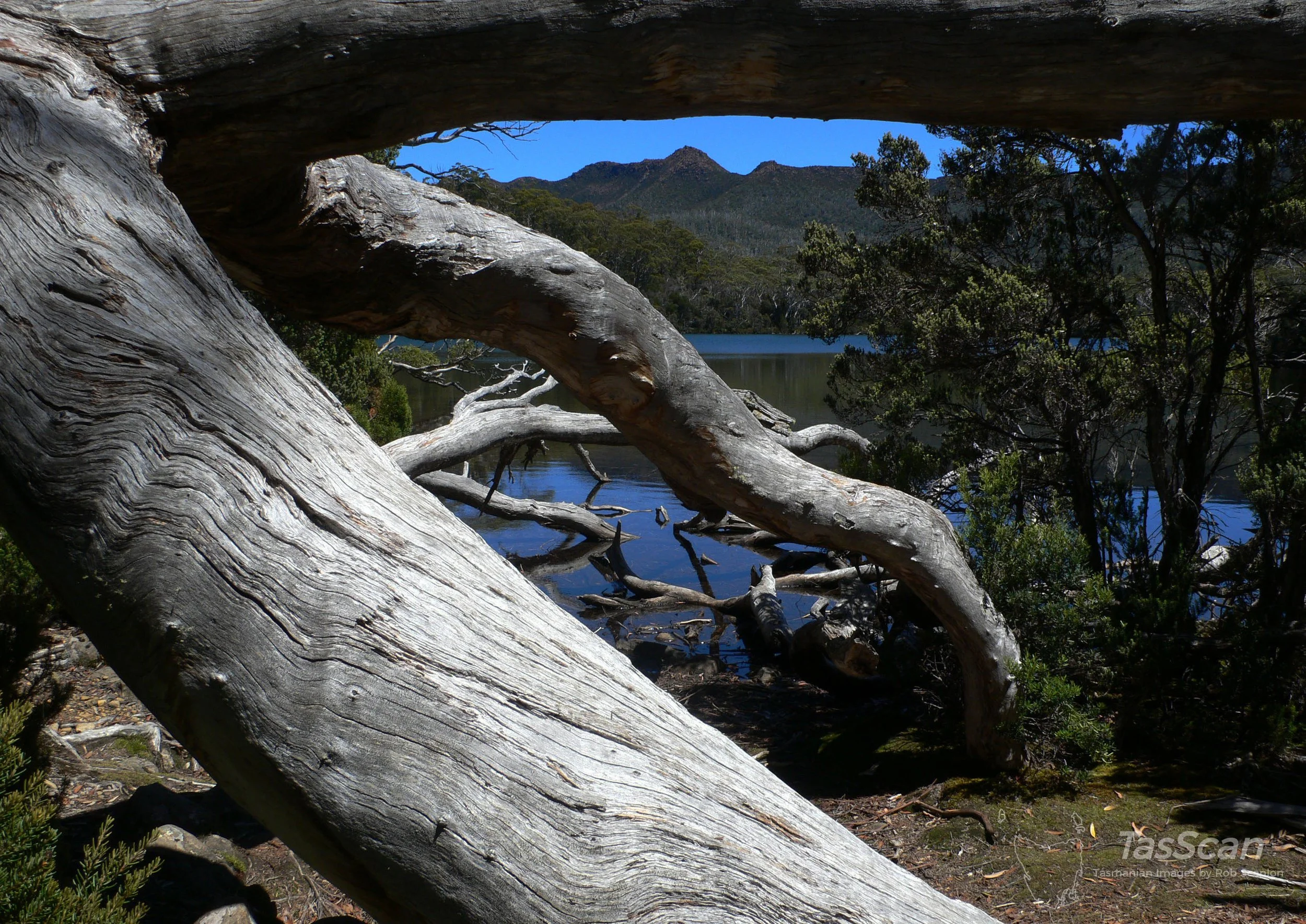 View through logs on the eastern shore of Shadow Lake near Lake St. Clair. Beautiful day walk with spectacular side trip to Little Hugel.